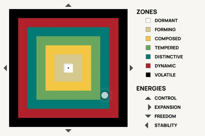 Freedom is the secondary Energy. It appears through Mover and Liberator behaviour: move quickly, stream the test, publish the ambition, return quickly after failure, bypass conventional media patterns where possible.